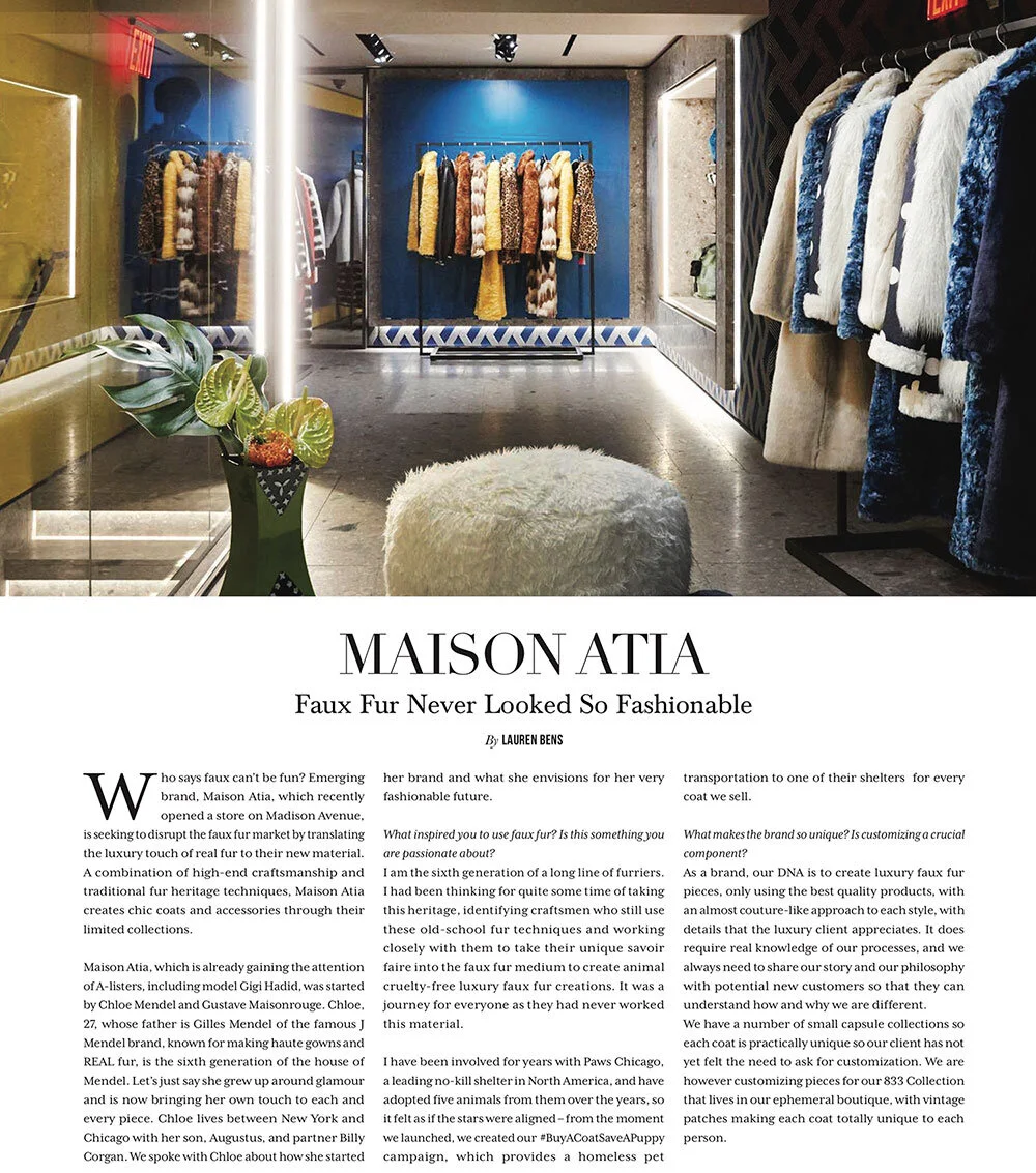 Maison Atia, a luxury faux fur collection designed by Chloe Mendel, daughter of famed fur designer, Gilles Mendel and Gustave Maisonrouge, combines a modern aesthetic and sensibility with traditional fur heritage craftsmanship. Maison Atia looks to reinvent and elevate the faux fur market, offering a genuinely luxurious alternative to fur coats and accessories. Crafted in New York City by highly skilled artisans, Maison Atia’s collection reimagines signatures of classic Parisian chic and puts a sophisticated spin on modern New York staples. The brand offers women beautifully designed, truly glamorous faux fur outerwear that feels as desirable and sumptuous as the real thing. Versatility and functionality are integral components of the collections, emphasizing wearability and shifting ethical priorities.